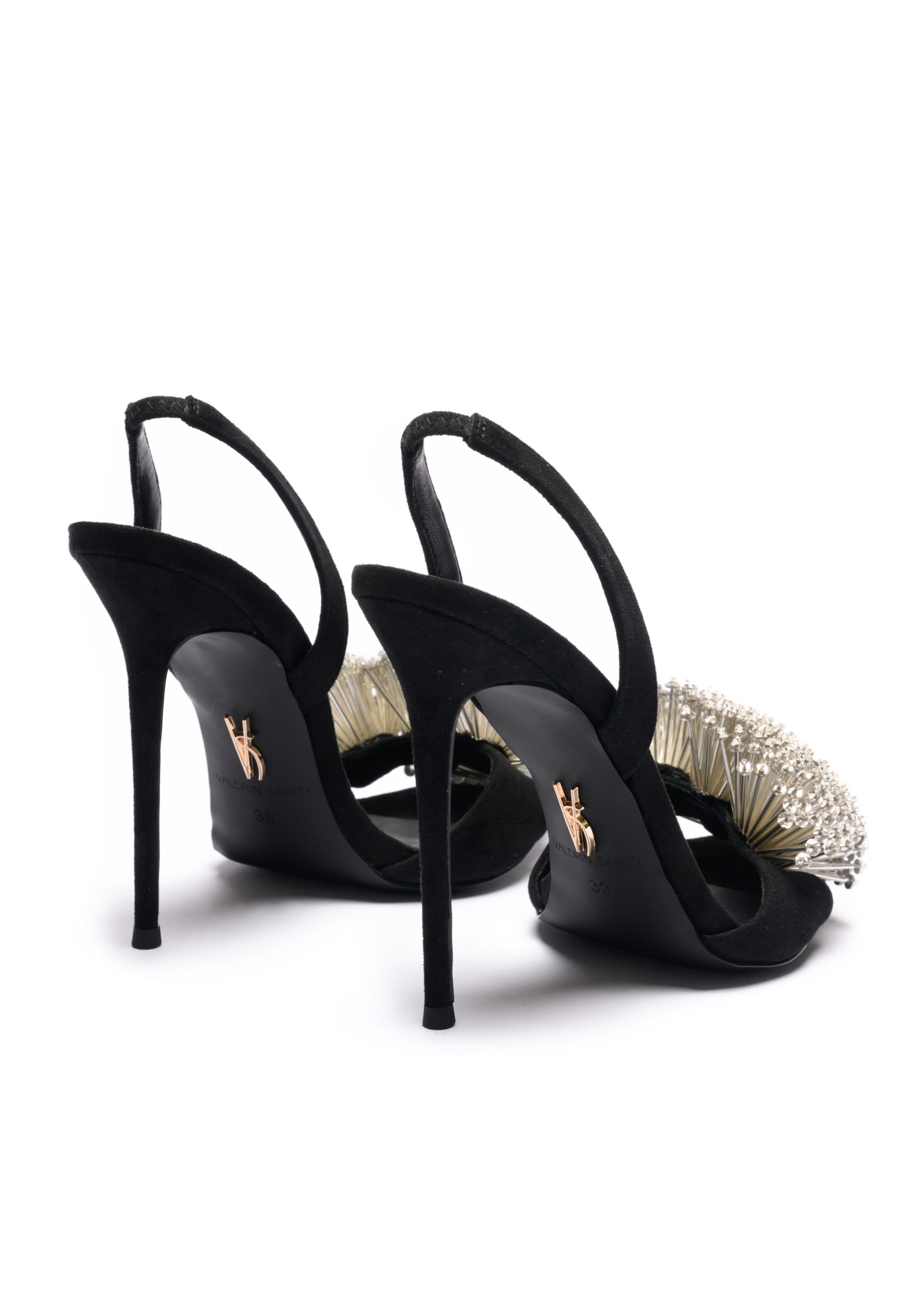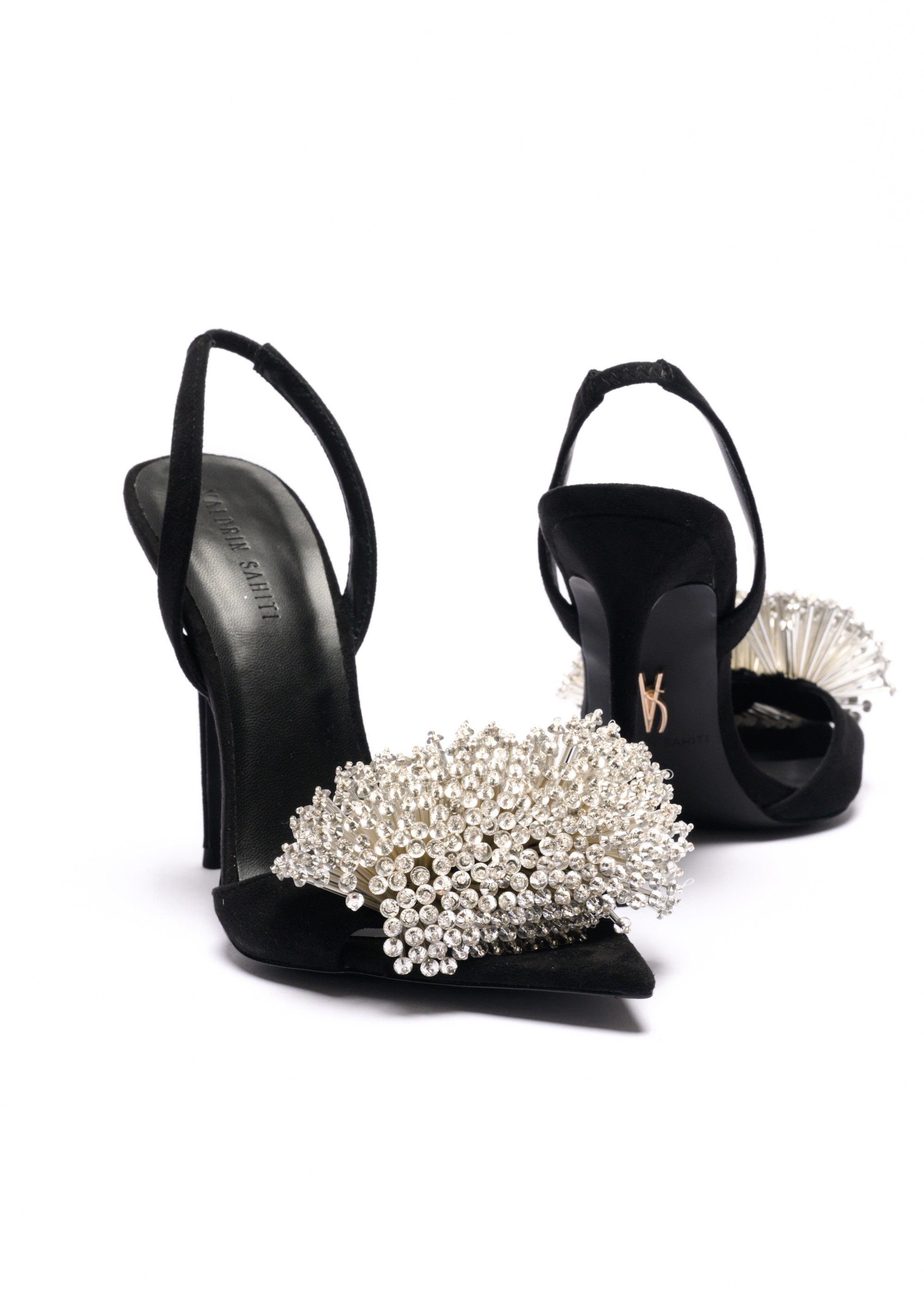 Midnight Halo Stiletto, adorned with a radiant crystal bloom that fans elegantly across the toe. Set atop a sleek 120mm stiletto heel, this striking silhouette sculpts and elongates the leg with effortless poise. Designed to command attention at every step, it embodies modern opulence, refined drama, and unforgettable evening allure.