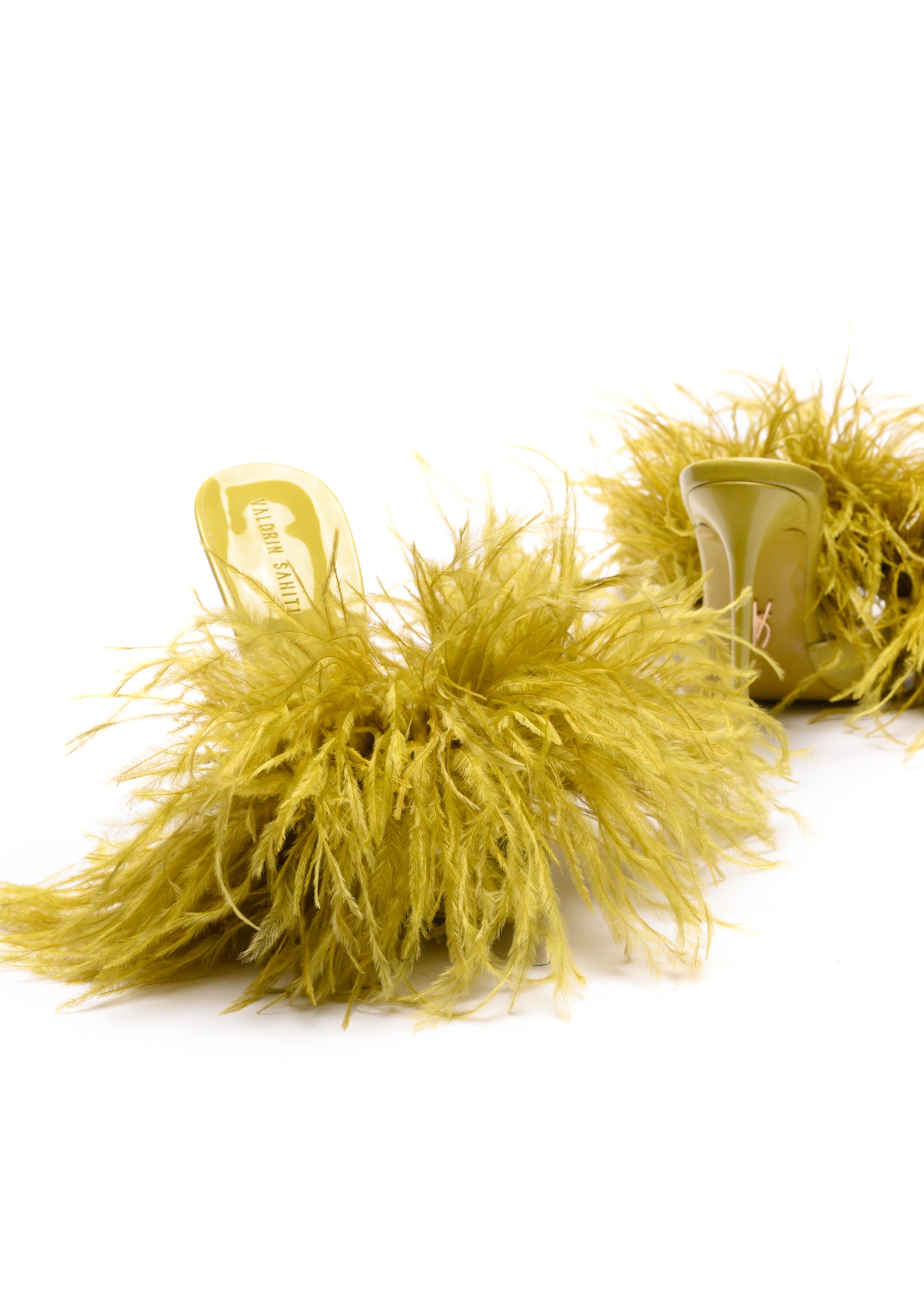 The Eda Feather Mules 120 in Olive combine sculptural elegance with playful glamour. Designed with a sleek high-gloss silhouette and finished with soft ostrich feather detailing, this statement mule stands on a striking 120 mm stiletto heel.