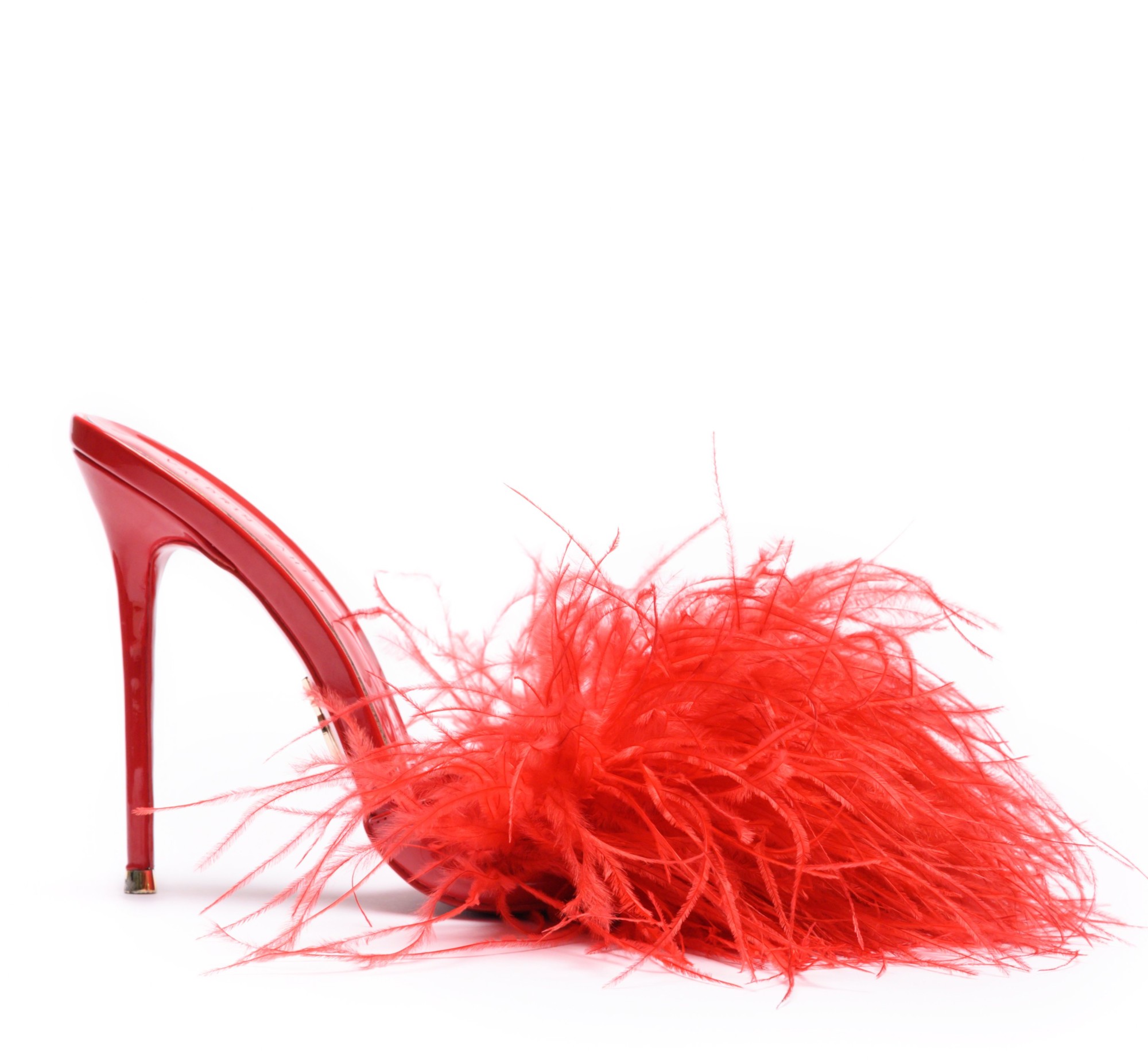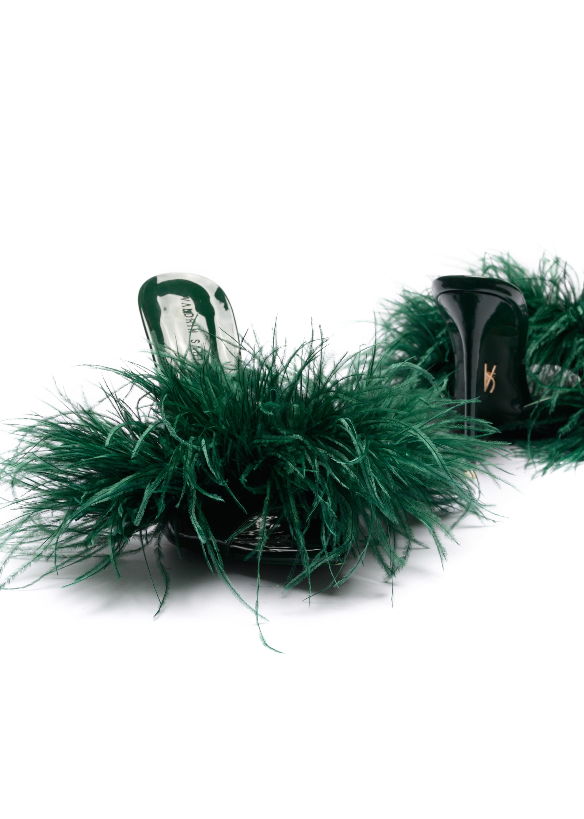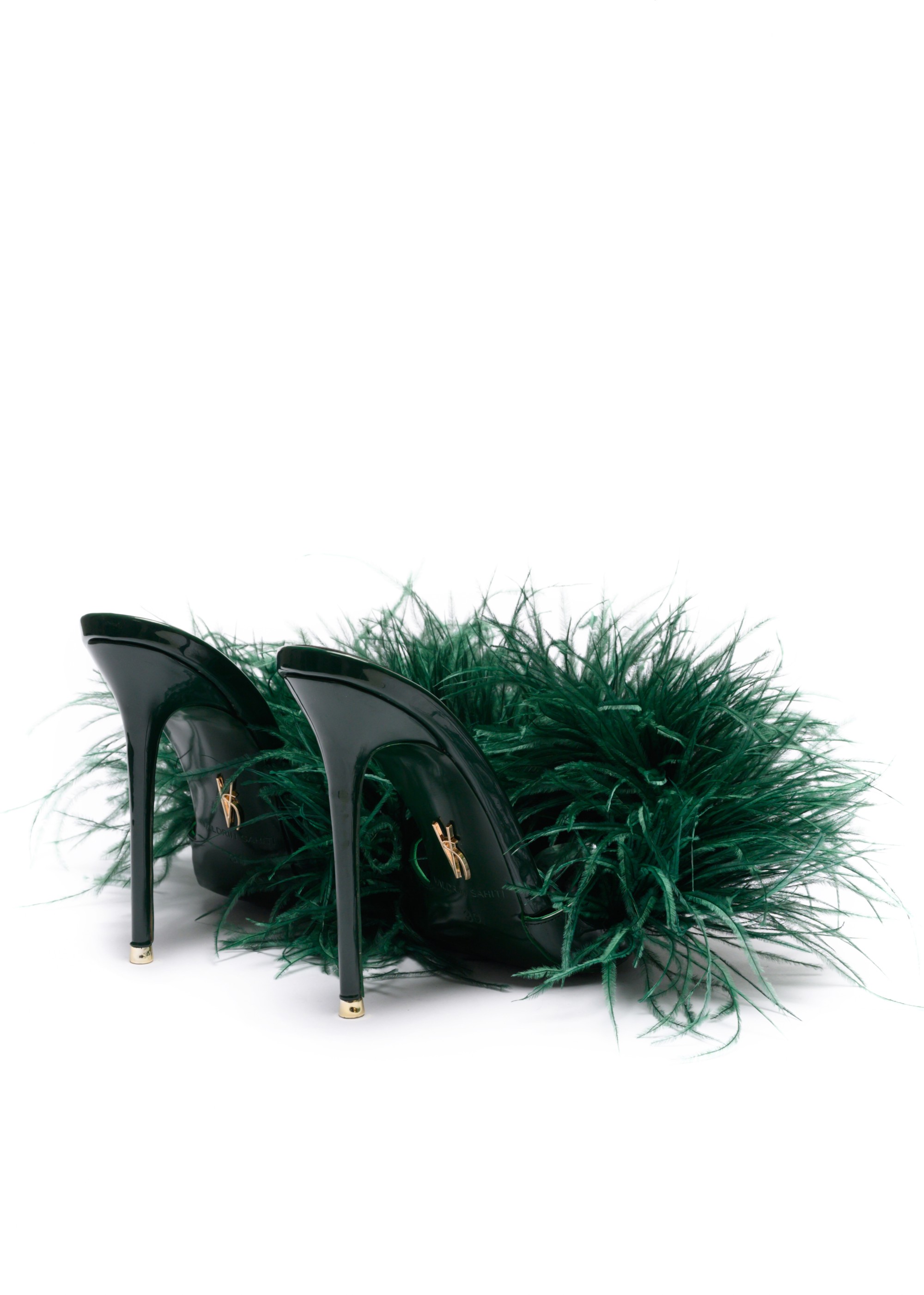 The Eda Feather Mules 120 in Emerald combine sculptural elegance with playful glamour. Designed with a sleek high-gloss silhouette and finished with soft ostrich feather detailing, this statement mule stands on a striking 120 mm stiletto heel.