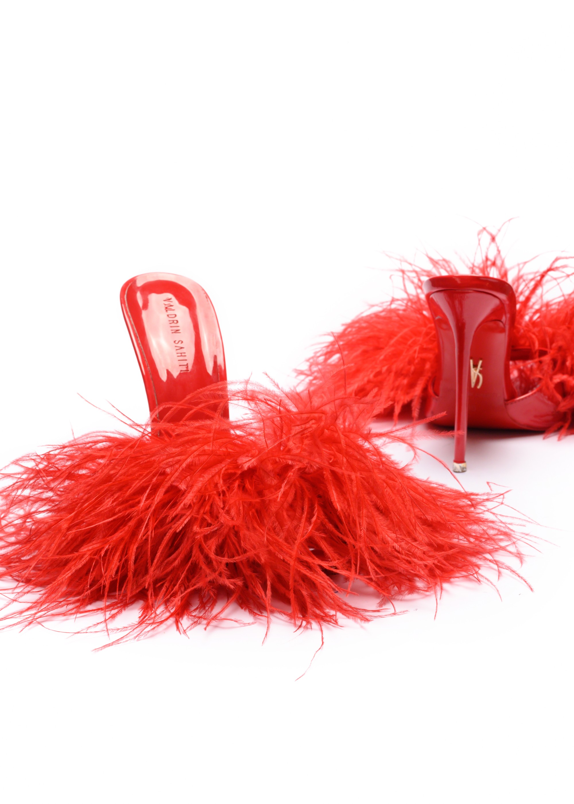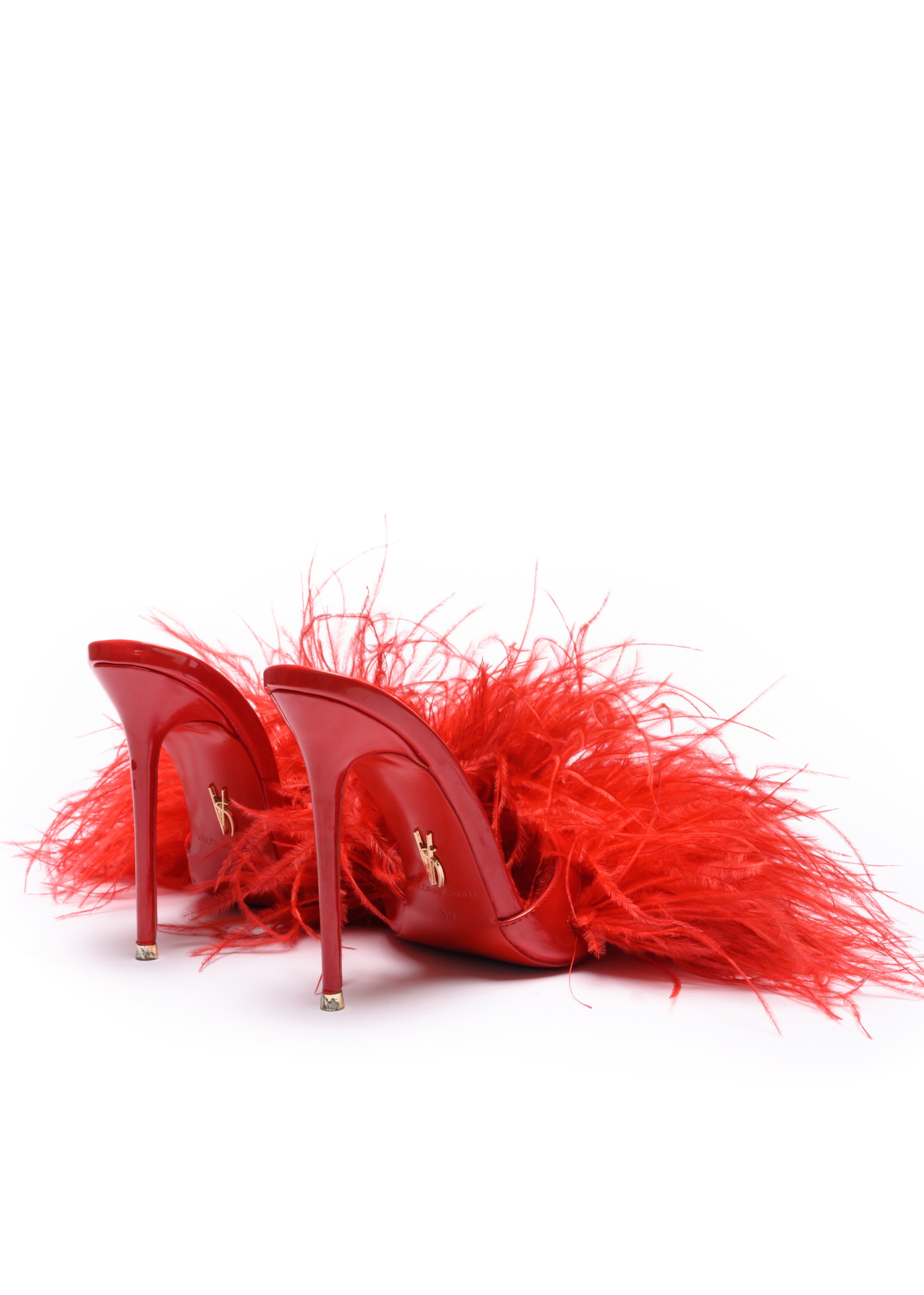 The Eda Feather Mules 120 in Ferrari Red combine sculptural elegance with playful glamour. Designed with a sleek high-gloss silhouette and finished with soft ostrich feather detailing, this statement mule stands on a striking 120 mm stiletto heel.